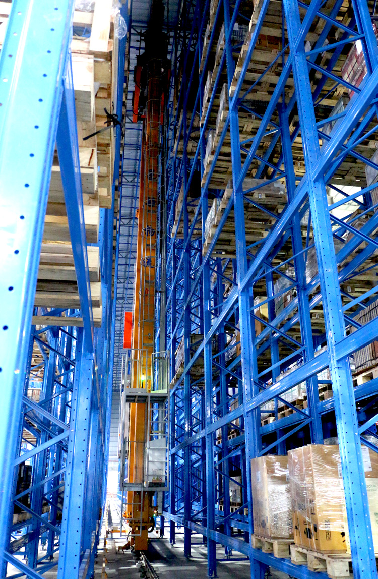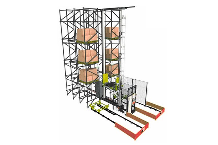 - เครนอัตโนมัติ (Storage and Retrieval Machine หรือ SRM หรือ Stacker Crane) ที่วิ่งในรางหรือช่องทางระหว่างชั้นวาง ทำหน้าที่จัดเก็บหรือเบิกจ่ายสินค้าจากชั้นวาง