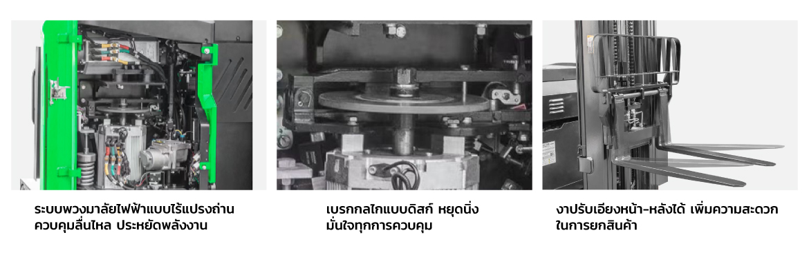 - มอเตอร์ AC ทั้งขับเคลื่อนและยก ไม่ต้องบำรุงรักษา ลดต้นทุนระยะยาว
