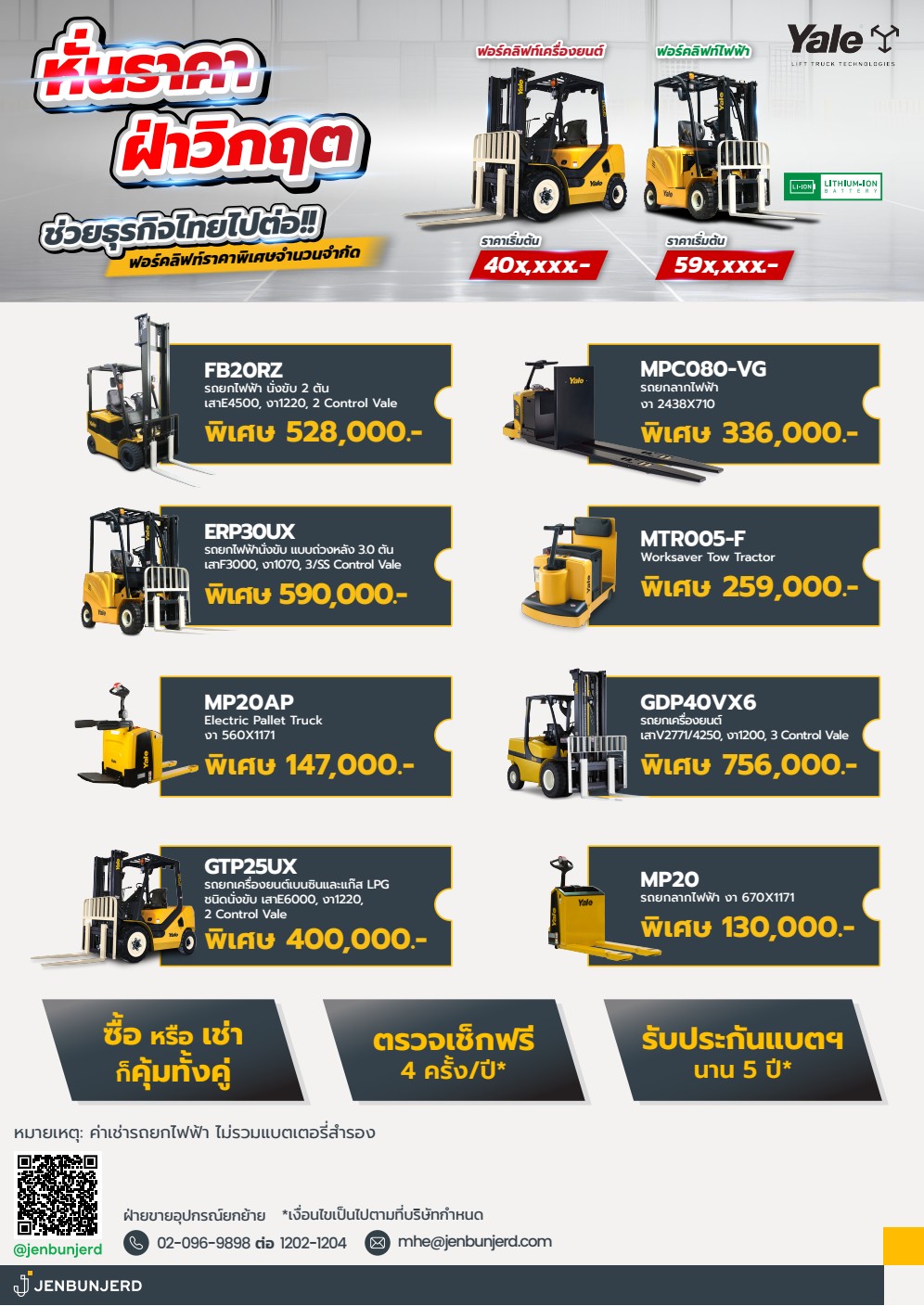 โปรแรงจองด่วน! รถยก Yale เริ่ม 147,000 บาท ซื้อก็ได้ - เช่าก็มี แบรนด์คุณภาพจากอเมริกา ของดีมีน้อย รีบจองก่อนหมด! : เจนบรรเจิด (Jenbunjerd) ผู้นำด้านการผลิต จัดจำหน่าย และส่งออกอุปกรณ์จัดเก็บยกย้ายที่มีความหลากหลาย