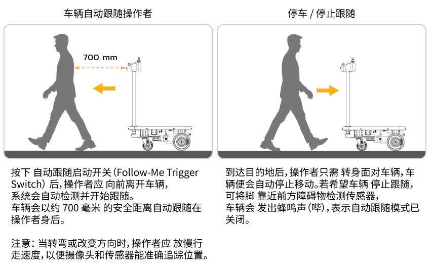 通过 自动跟随机器人搬运车,让您的工厂和仓库物料搬运作业更加高效、安全、现代化。 该智能搬运车以先进的摄像头与人体识别传感技术为核心,能够精准识别并自动跟随操作者行进。只需向前行走,车辆便会保持安全距离自动跟随。 其最高载重达 500 公斤,非常适用于工厂、仓库及生产线中的物料运输与内部物流作业。